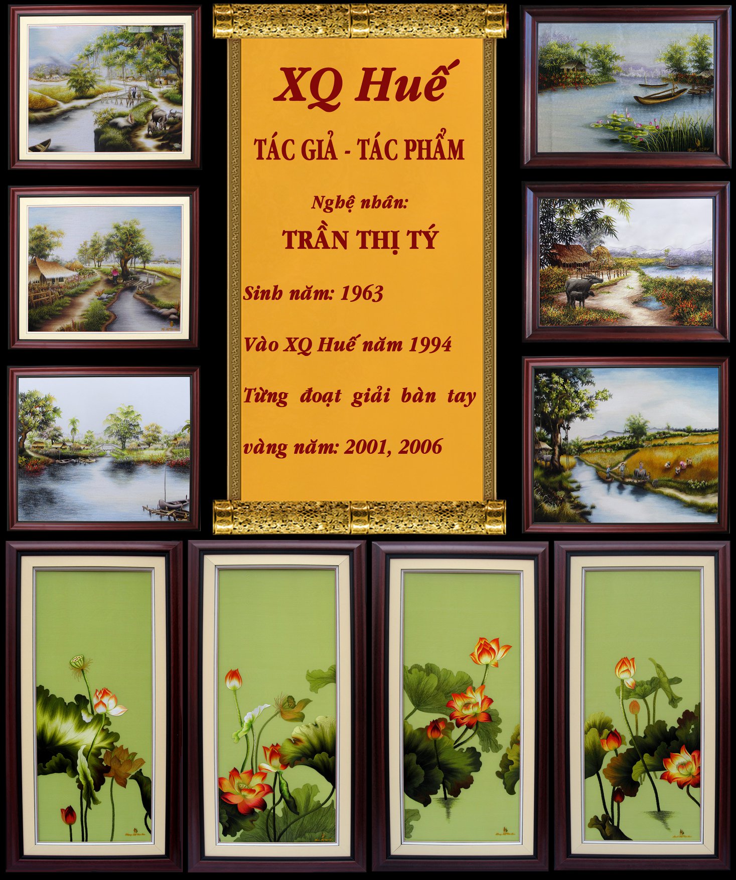 Những tác phẩm thêu tay của nghệ nhân Trần Thị Tý - được trưng bày tại bảo tàng nghệ thuật thêu XQ Huế.