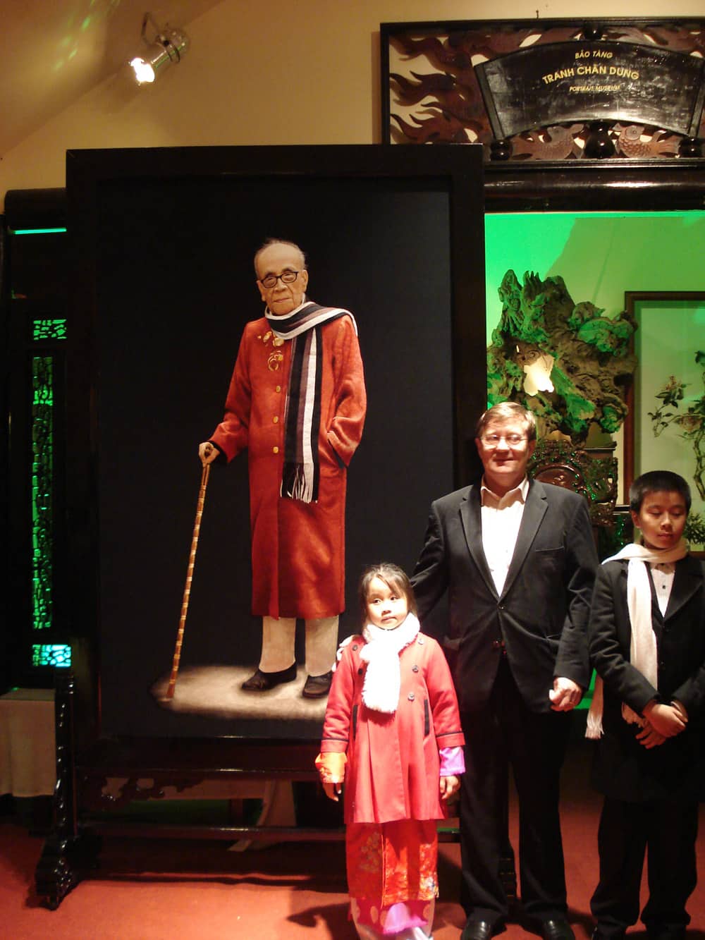 Tôi rất vinh dự được có mặt tại XQ Đà Lạt Sử Quán để biết thêm một thể loại tranh mới của XQ đó là tranh thêu chân dung. Thế khi nhìn vào bức tranh này do chính cha mẹ của hai cháu và những phụ nữ XQ tạo nên hai cháu có cảm nhận rằng bác Vũ Khiêu như đang thể hiện thật sự ở nơi này với gương mặt ấn tượng và đầy biểu cảm hay không, nhất là cái cách người ta thổi hồn vào bức tranh.