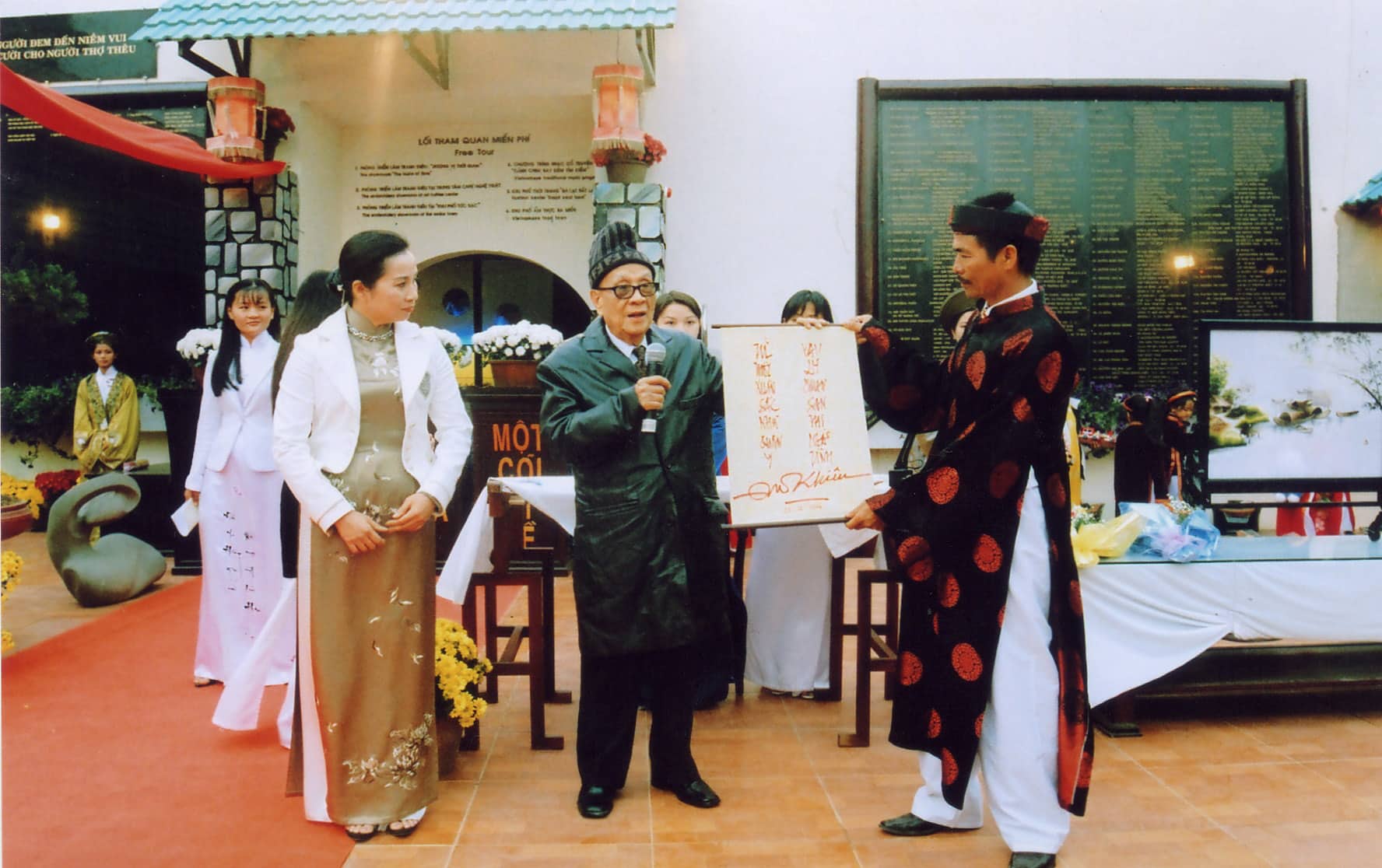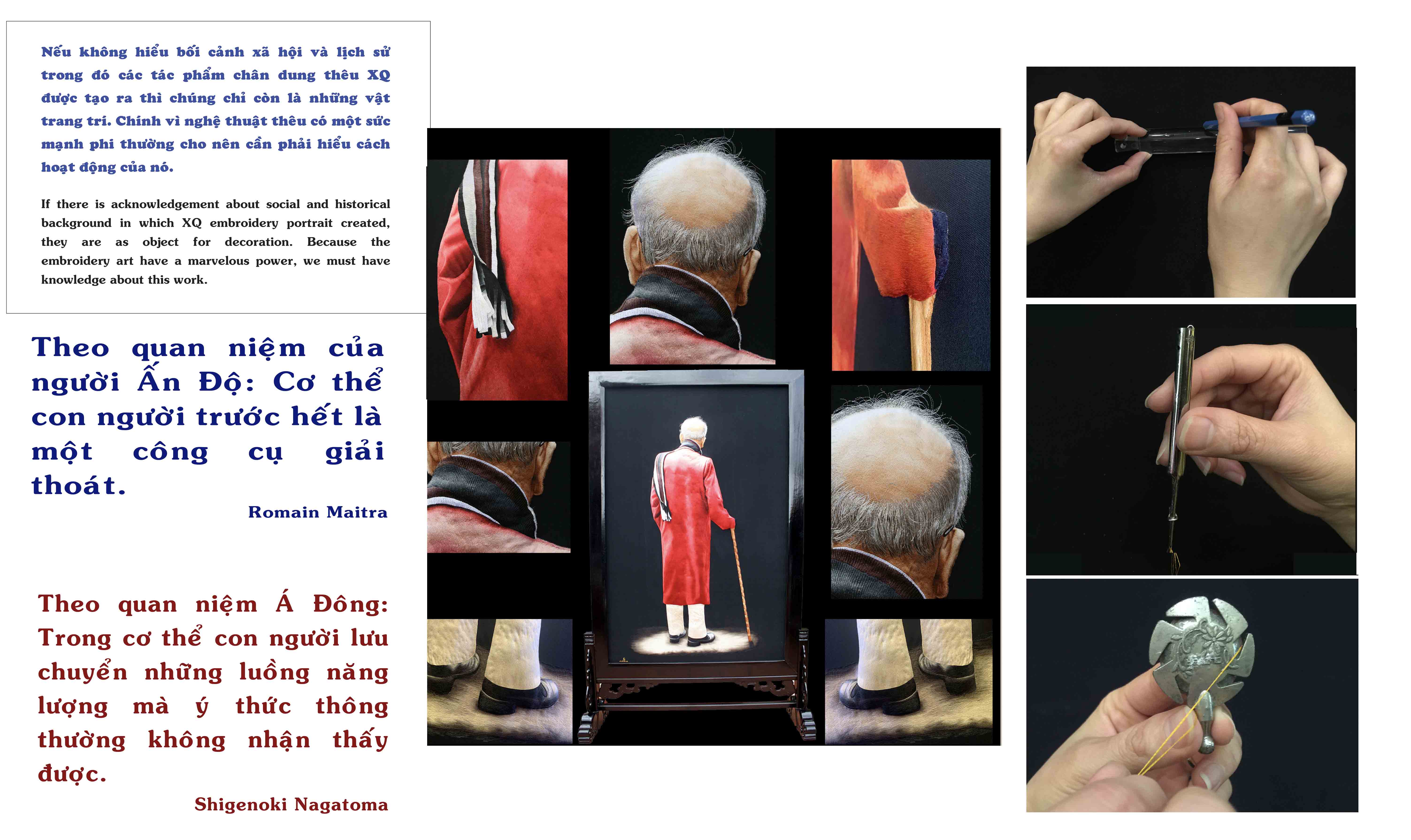 4.Xin cho phép tôi có vài lời để nói với đông đảo đội ngũ mĩ nhân của công ty thêu XQ, những người đã thể hiện tinh thần yêu nước, đem hết trí tuệ, tài năng và tâm huyết của mình thêu nên những bức tranh mang hồn thiêng của non nước Việt Nam, rải khắp trên mọi miền của Tổ quốc. Đặc biệt là đứng trước tác phẩm rộng lớn mà các bạn đã dành công sức trong mấy năm nay, tôi coi đây là một tặng vật vô giá đang ra đời từ trái tim vàng và bàn tay ngọc của các bạn. Tôi xin trân trọng tặng các bạn hai câu đối như sau: