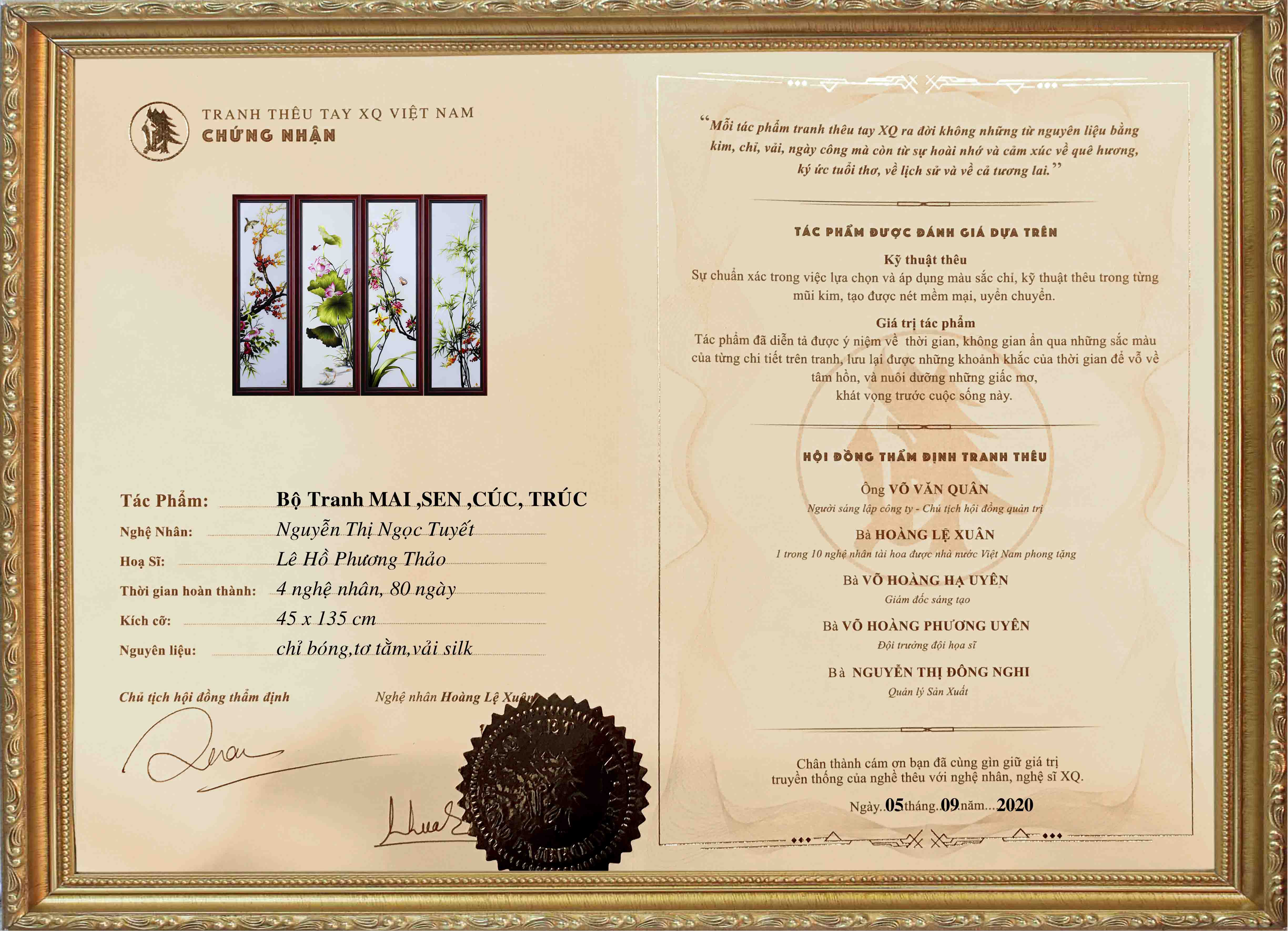 Mỗi tác phẩm tranh thêu XQ là một sinh linh run rẩy trước cuộc sống. Vì thế, luôn kèm theo chứng nhận và lý lịch cá tính.
