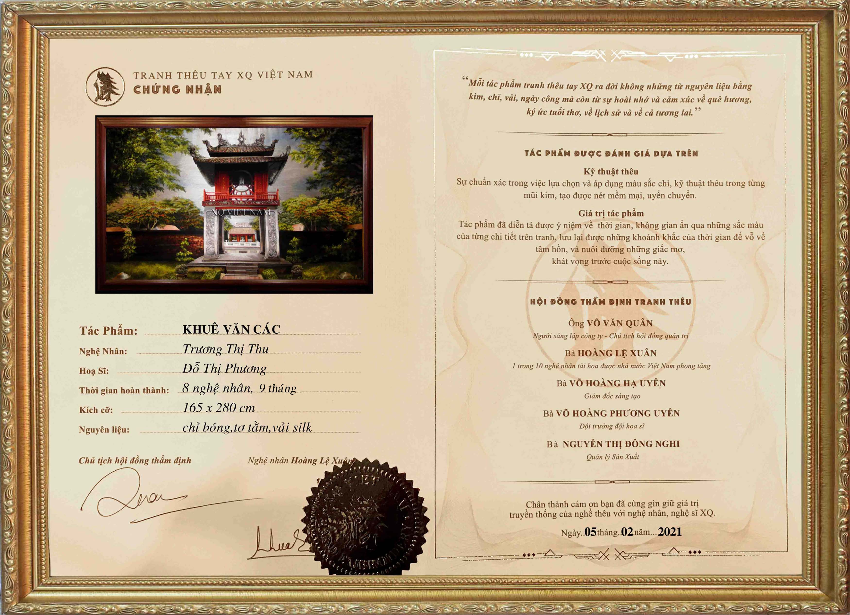 Mỗi tác phẩm tranh thêu XQ là một sinh linh run rẩy trước cuộc sống. Vì thế, luôn kèm theo chứng nhận và lý lịch cá tính.