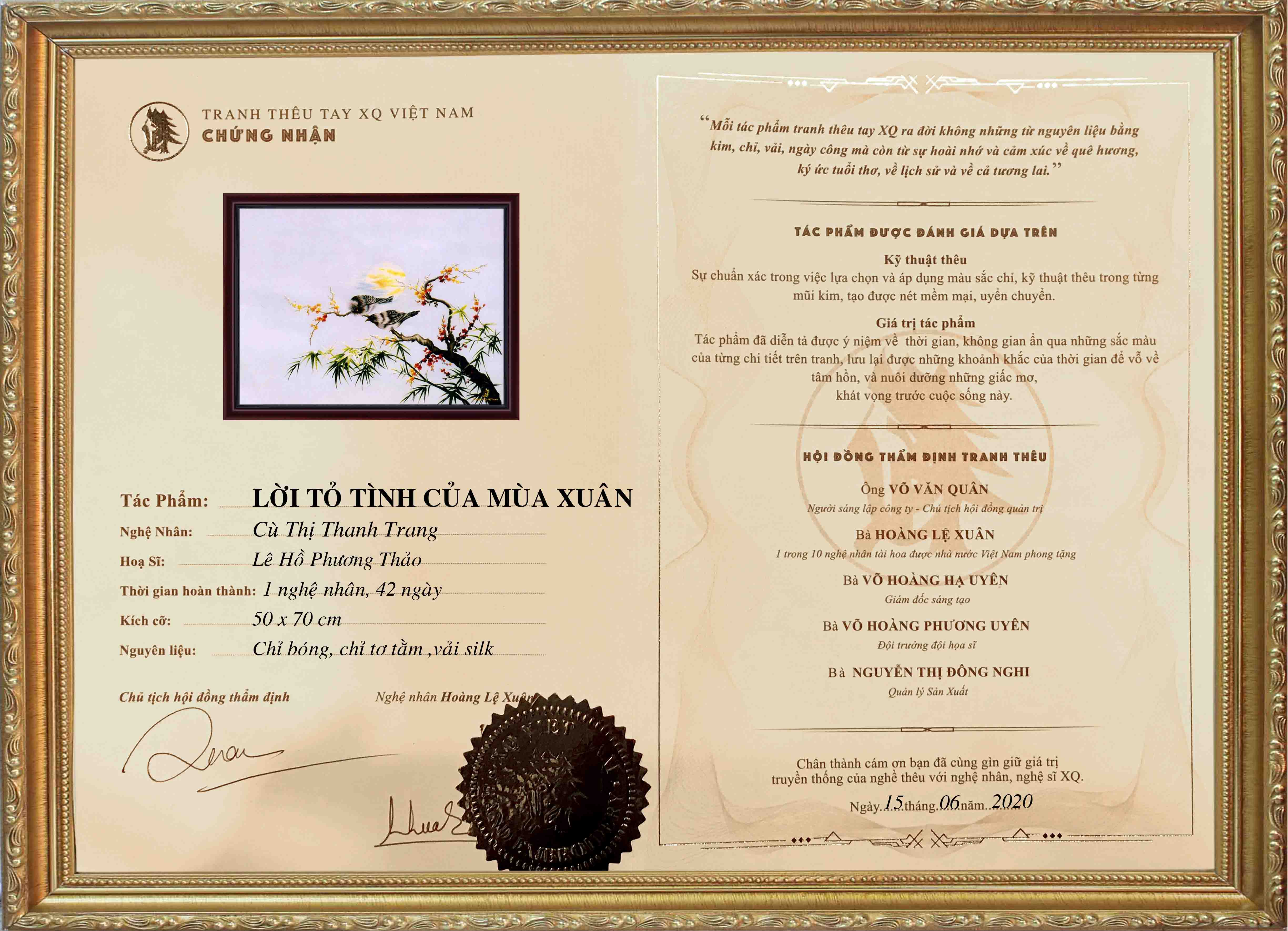 Mỗi tác phẩm tranh thêu XQ là một sinh linh run rẩy trước cuộc sống. Vì thế, luôn kèm theo chứng nhận và lý lịch cá tính.