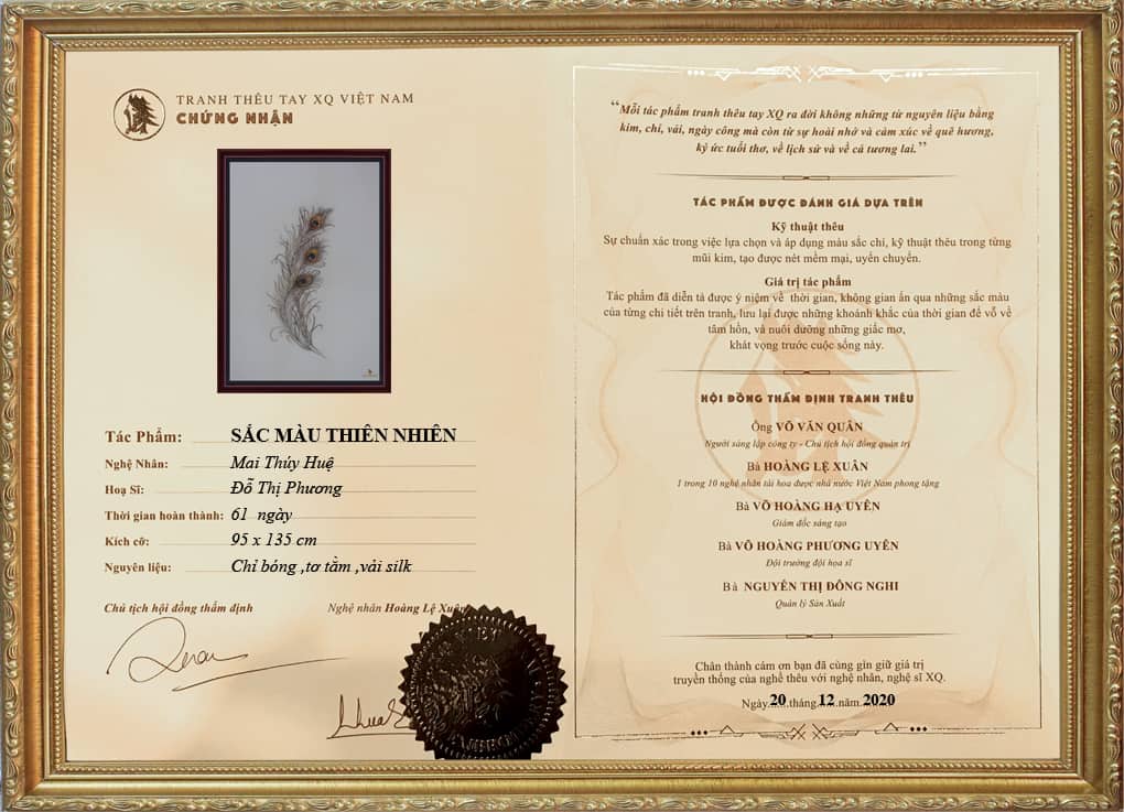 Mỗi tác phẩm tranh thêu XQ là một sinh linh run rẩy trước cuộc sống. Vì thế, luôn kèm theo chứng nhận và lý lịch cá tính.