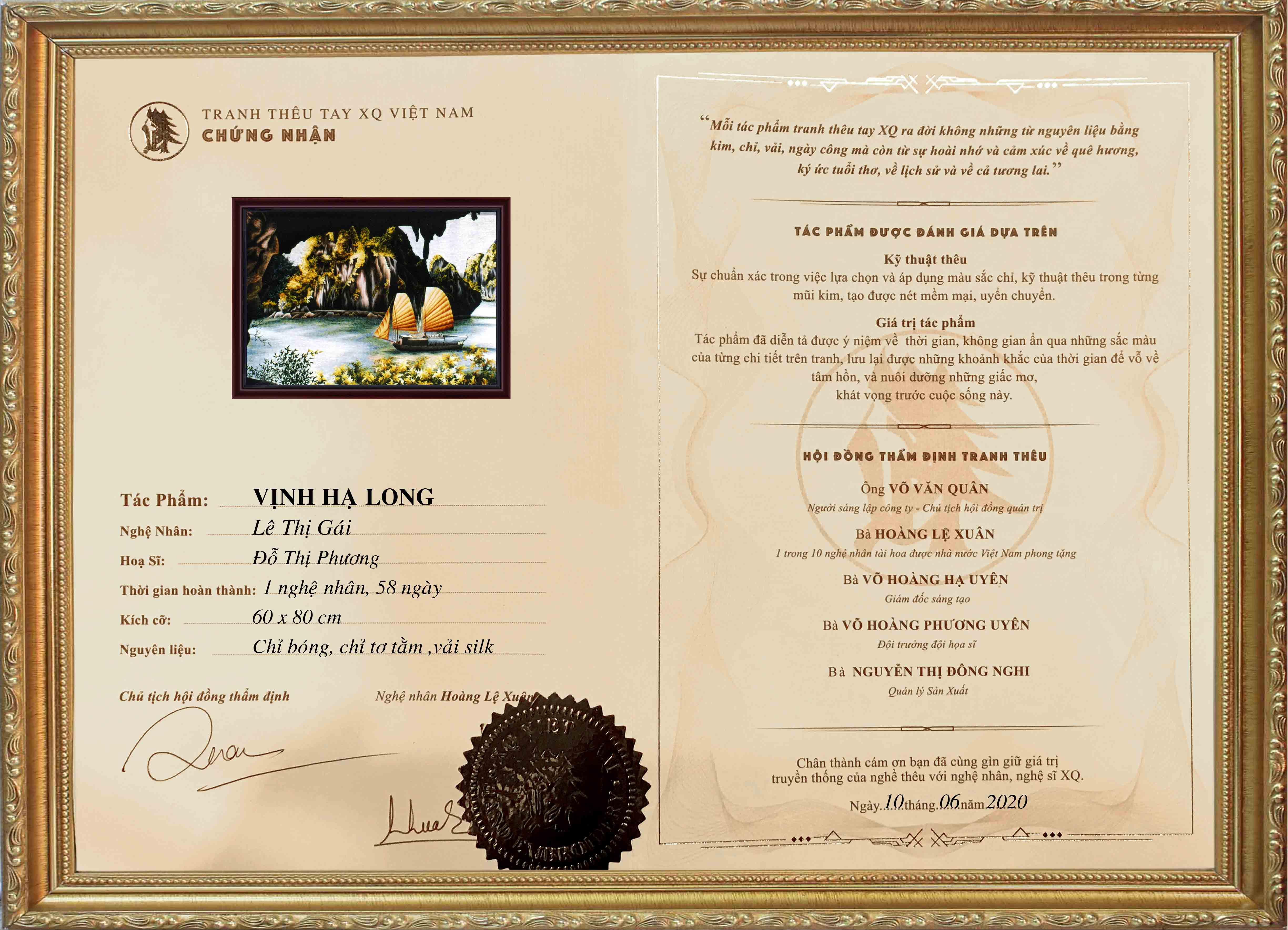 Mỗi tác phẩm tranh thêu XQ là một sinh linh run rẩy trước cuộc sống. Vì thế, luôn kèm theo chứng nhận và lý lịch cá tính.