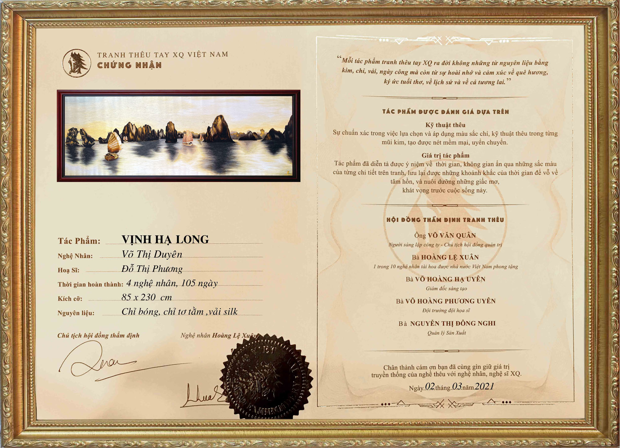Mỗi tác phẩm tranh thêu XQ là một sinh linh run rẩy trước cuộc sống. Vì thế, luôn kèm theo chứng nhận và lý lịch cá tính.