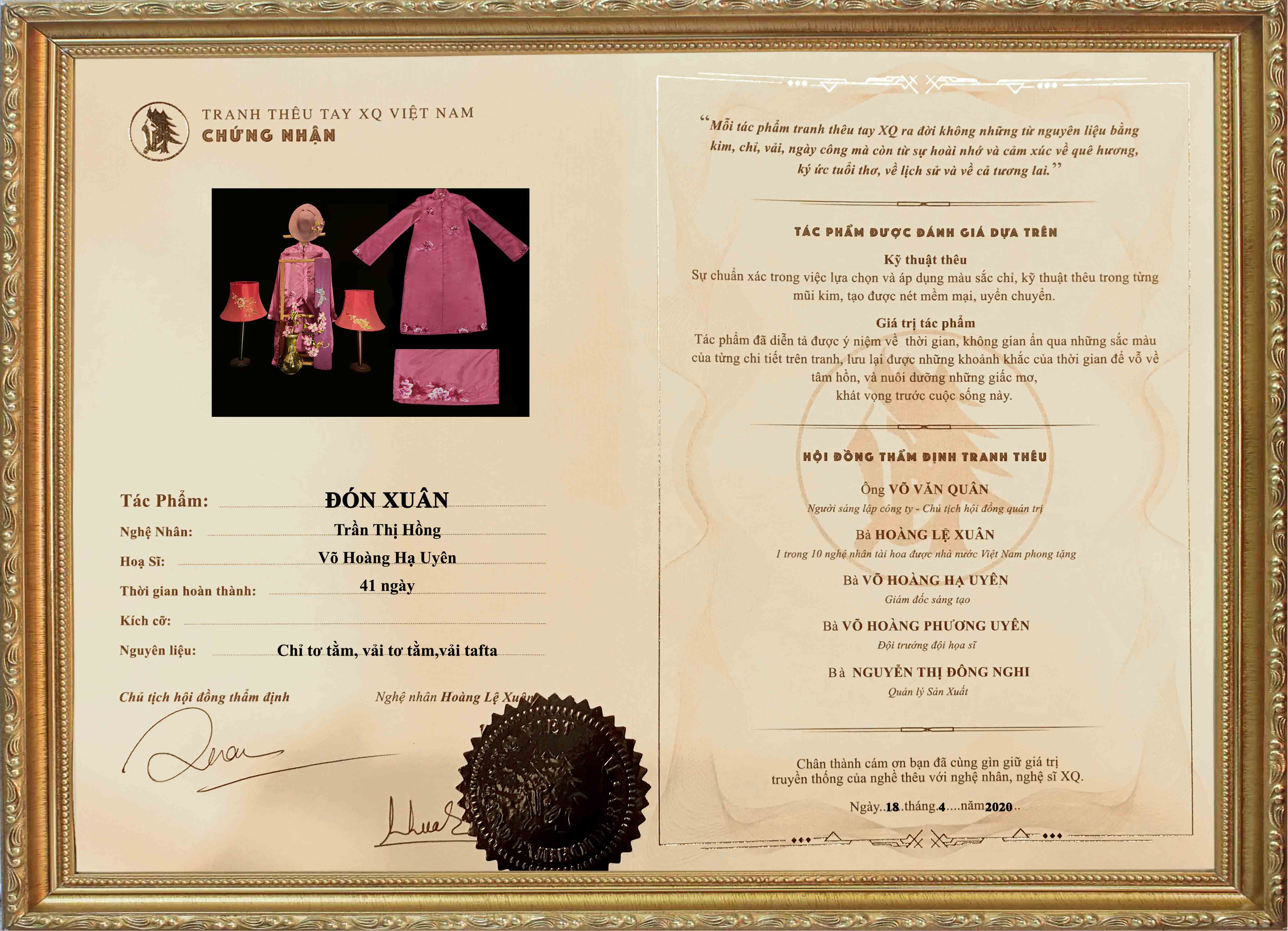 Mỗi tác phẩm tranh thêu XQ là một sinh linh run rẩy trước cuộc sống. Vì thế, luôn kèm theo chứng nhận và lý lịch cá tính.